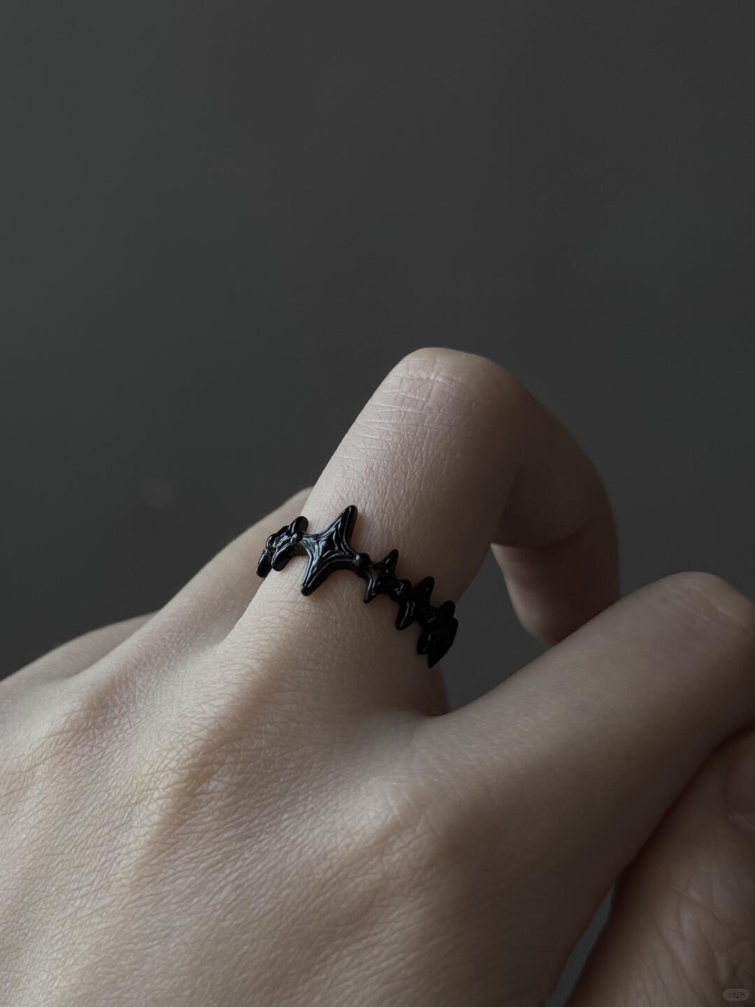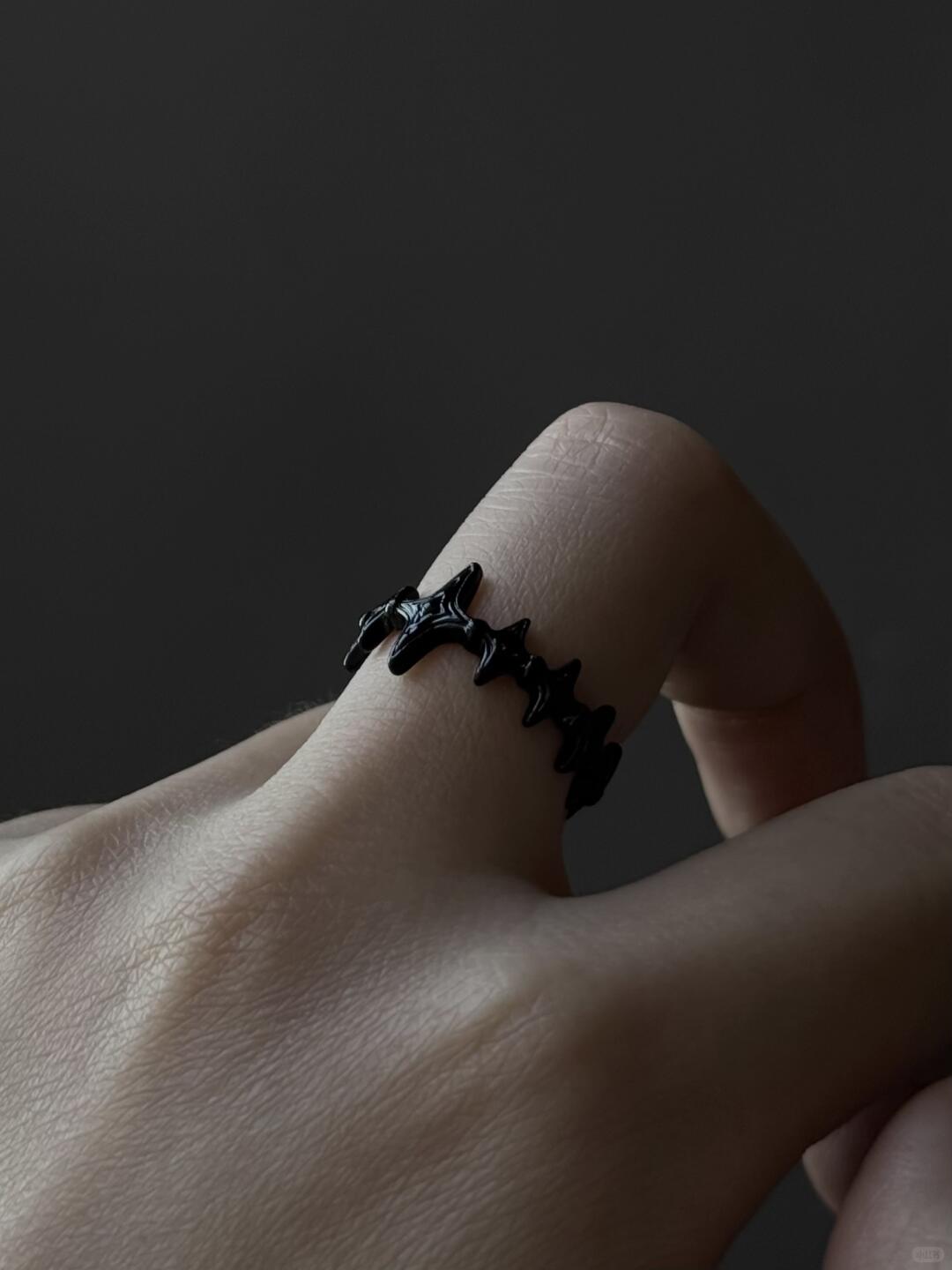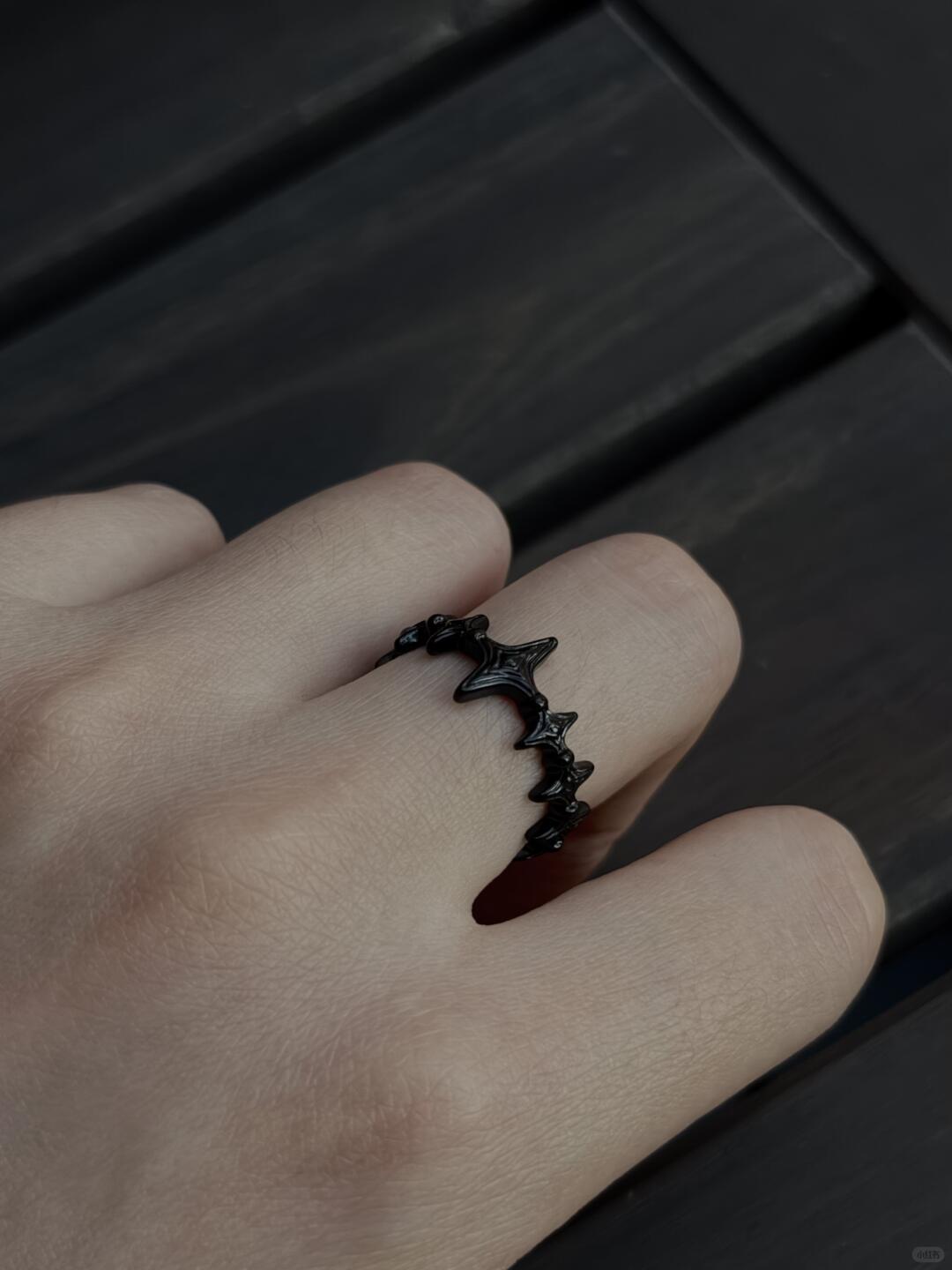 La superficie dell'anello imita la pietra screpolata e la luce stellare frammentata: ruvida, irregolare, con scaglie in rilievo come detriti cosmici. La sua finitura metallica è a metà strada tra l'argento ossidato e il bagliore della cenere. Un debole motivo a forma di ragno si posa su un bordo, nascosto se non tenuto in controluce. La fascia è di media larghezza, aderente ma suggestiva.