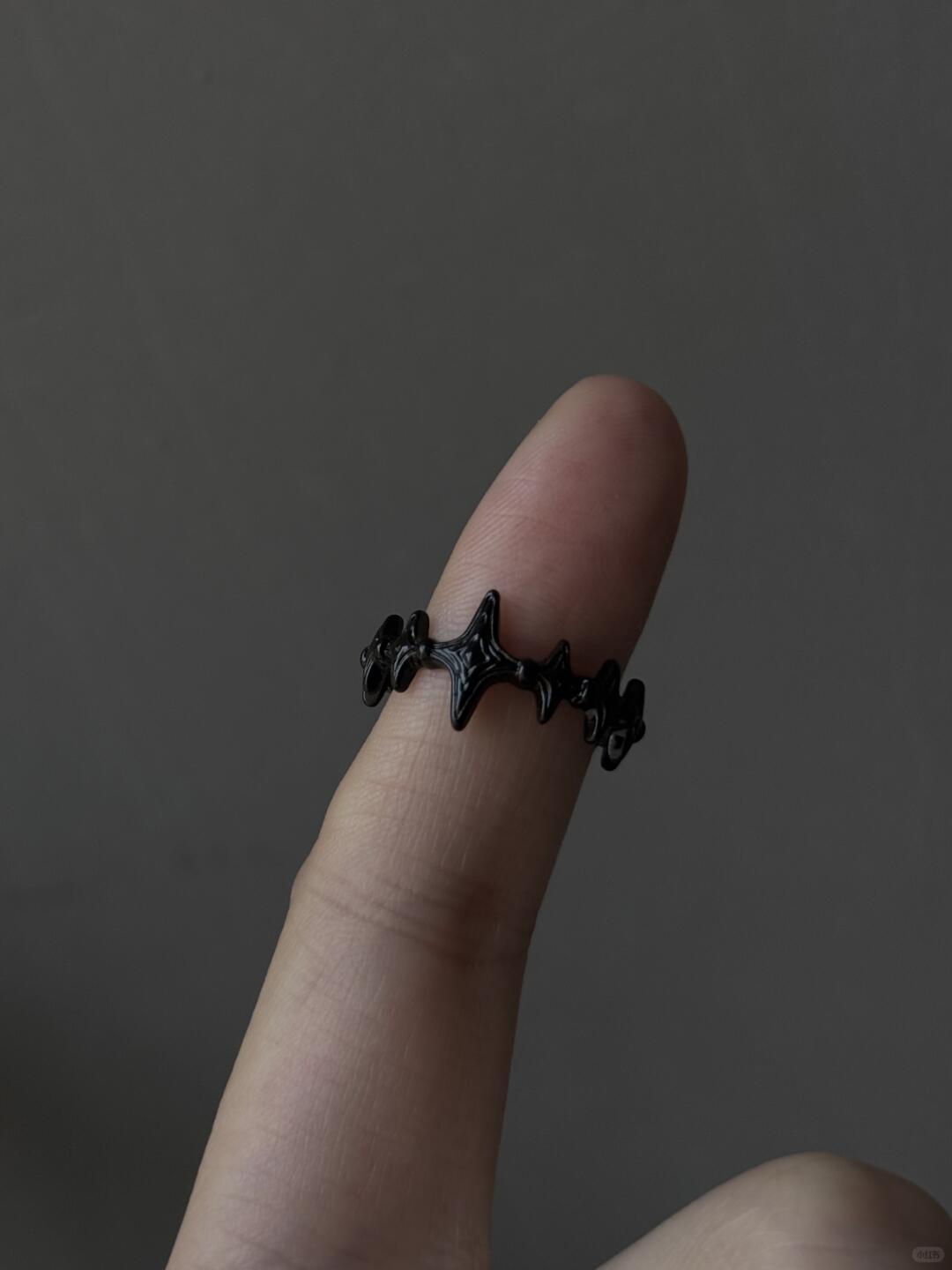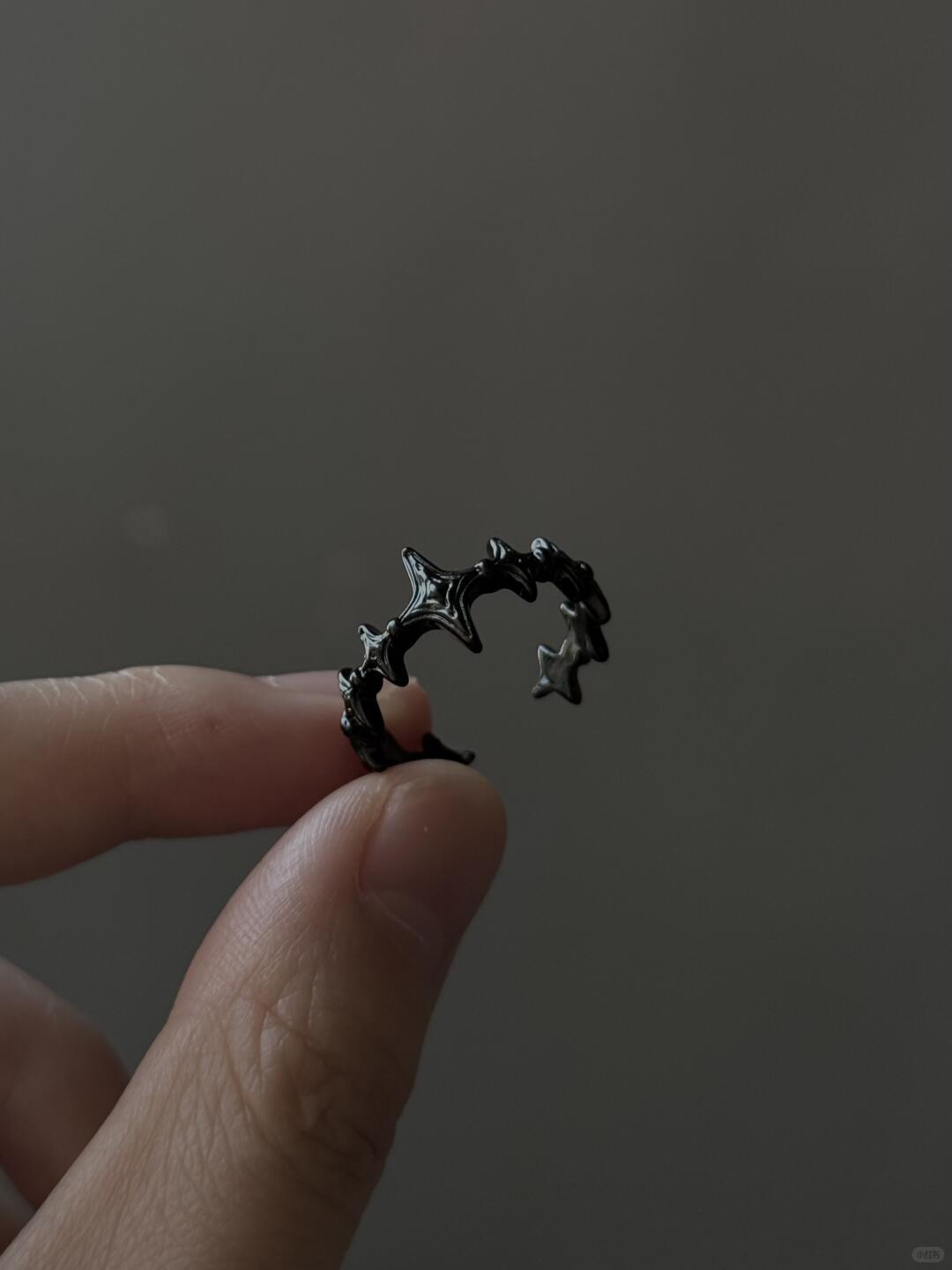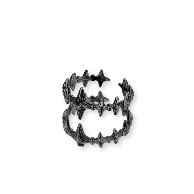 La superficie dell'anello imita la pietra screpolata e la luce stellare frammentata: ruvida, irregolare, con scaglie in rilievo come detriti cosmici. La sua finitura metallica è a metà strada tra l'argento ossidato e il bagliore della cenere. Un debole motivo a forma di ragno si posa su un bordo, nascosto se non tenuto in controluce. La fascia è di media larghezza, aderente ma suggestiva.