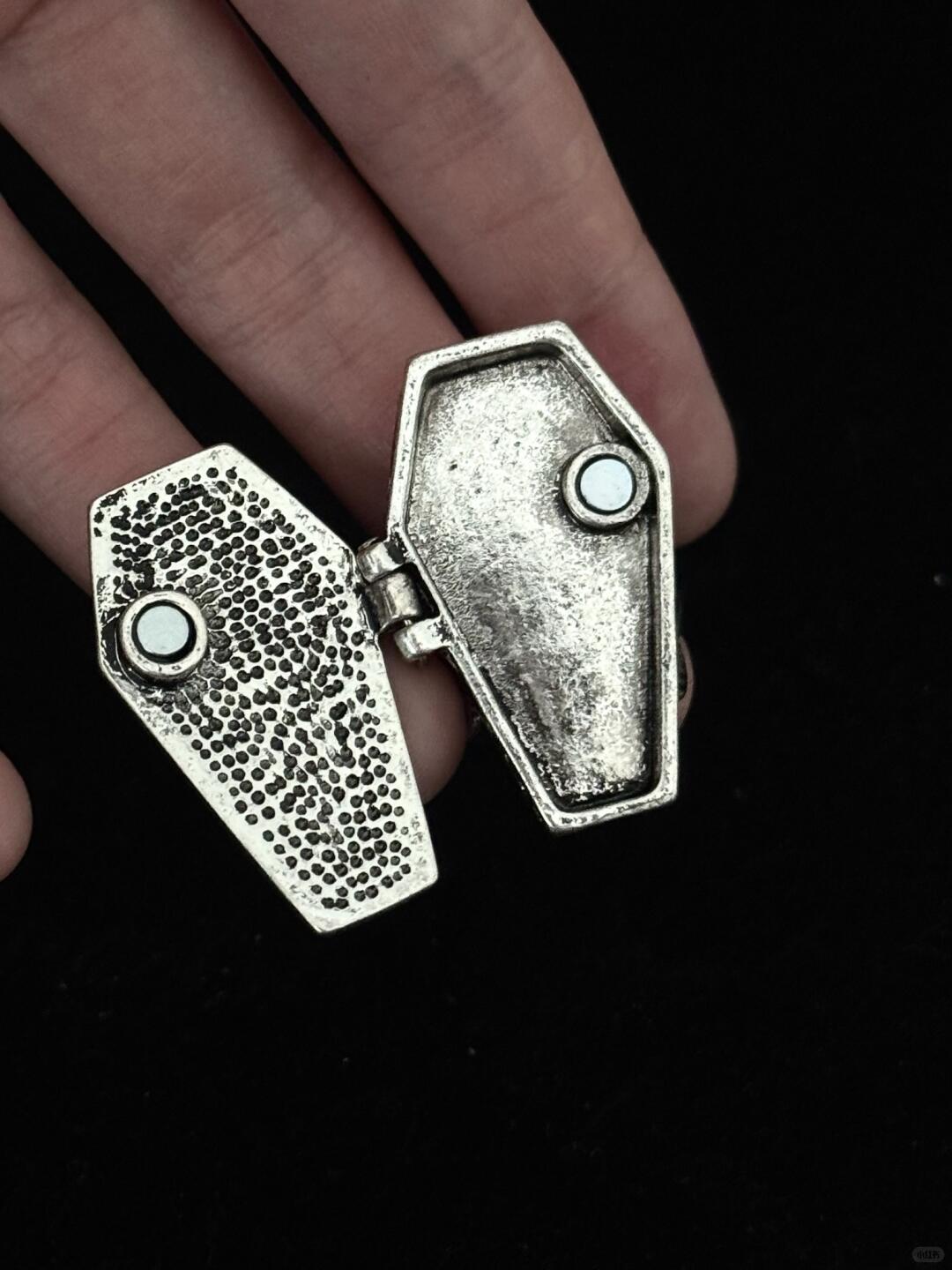 “In the coffin, just a locket and me.” The Coffin World Ring is a bold and introspective piece, a reflection on life, death, and the quiet beauty of impermanence. It’s a statement for those who find meaning in the darker corners of existence, where mirrors reveal the self and the soul.