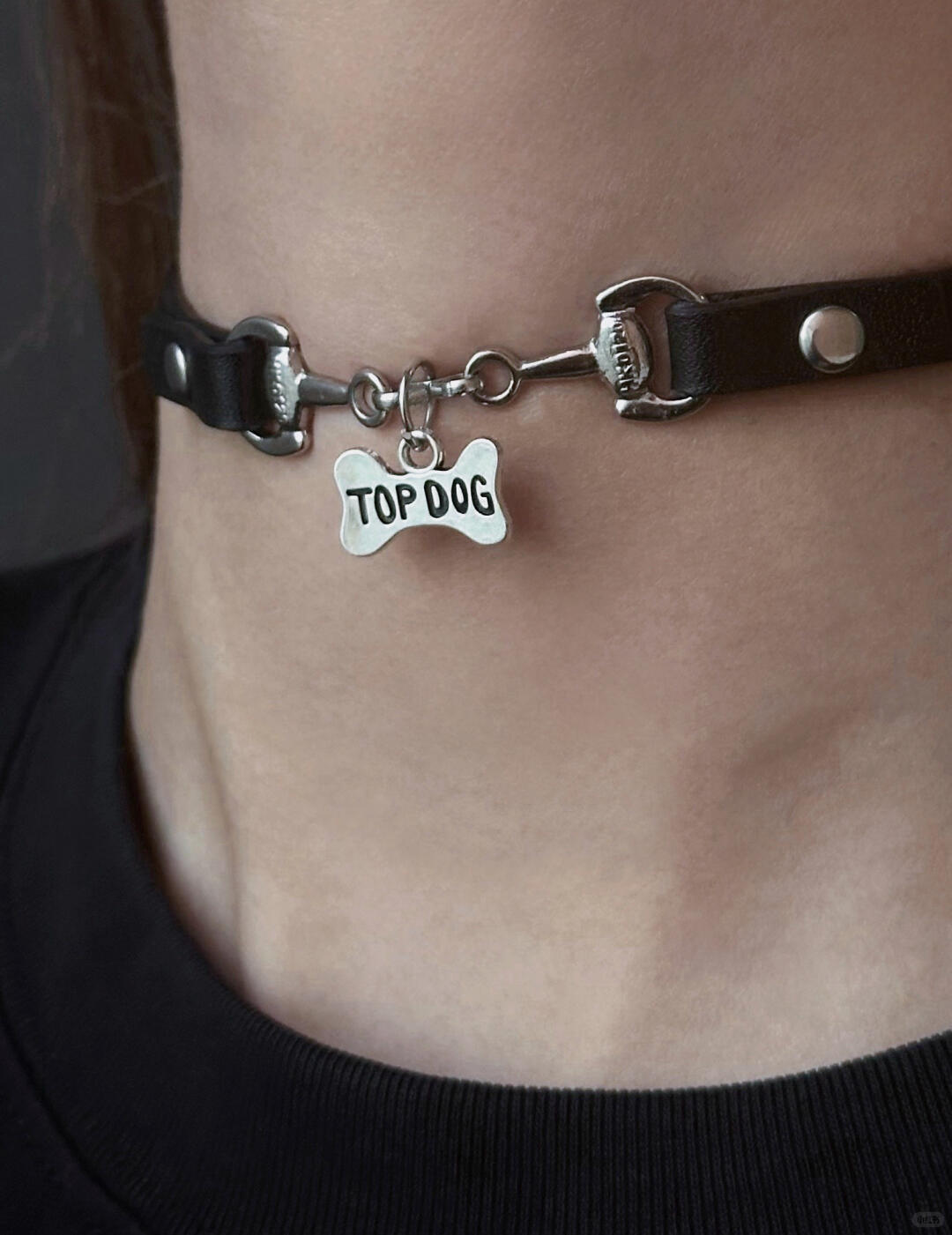 Crafted with a slim faux leather band and minimal heart tag accent, this choker rests at collarbone height with an adjustable clasp. Its look is subtly pet-coded — part devotion, part rebellion. A true Y2K accessory: emotionally loaded, visually clean.