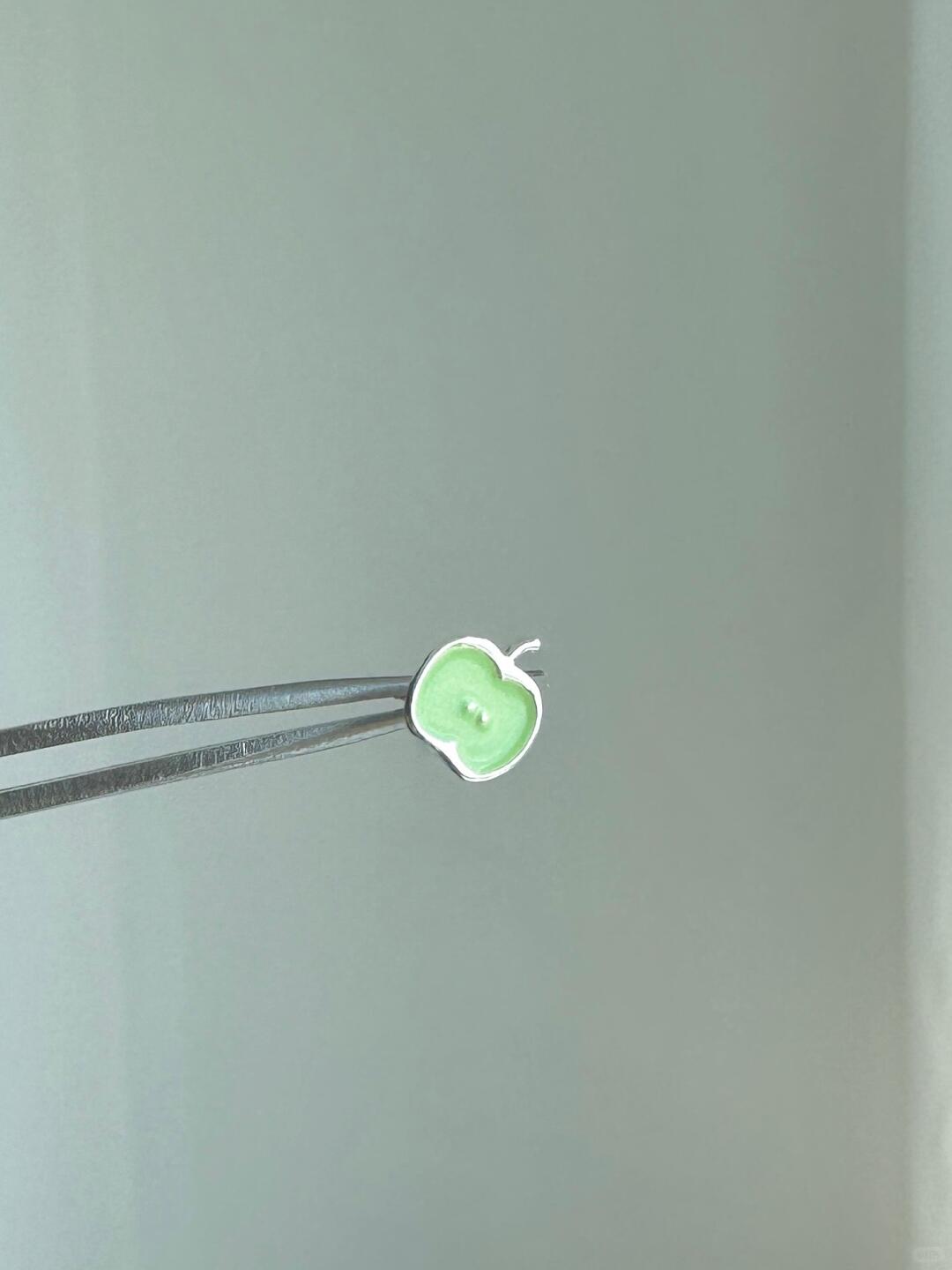 “Acidity is the entry to youth.” The Green Apple Paradise Stud Earrings let you taste a green summer with every glance. Unripe secrets lie at the core of each enamel apple, waiting for the light that turns green into sweetness.