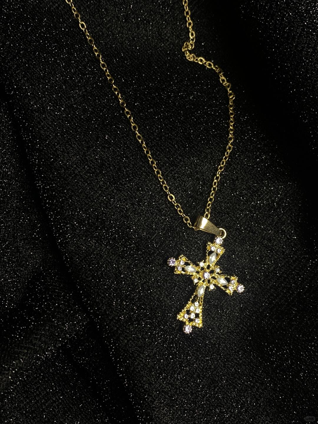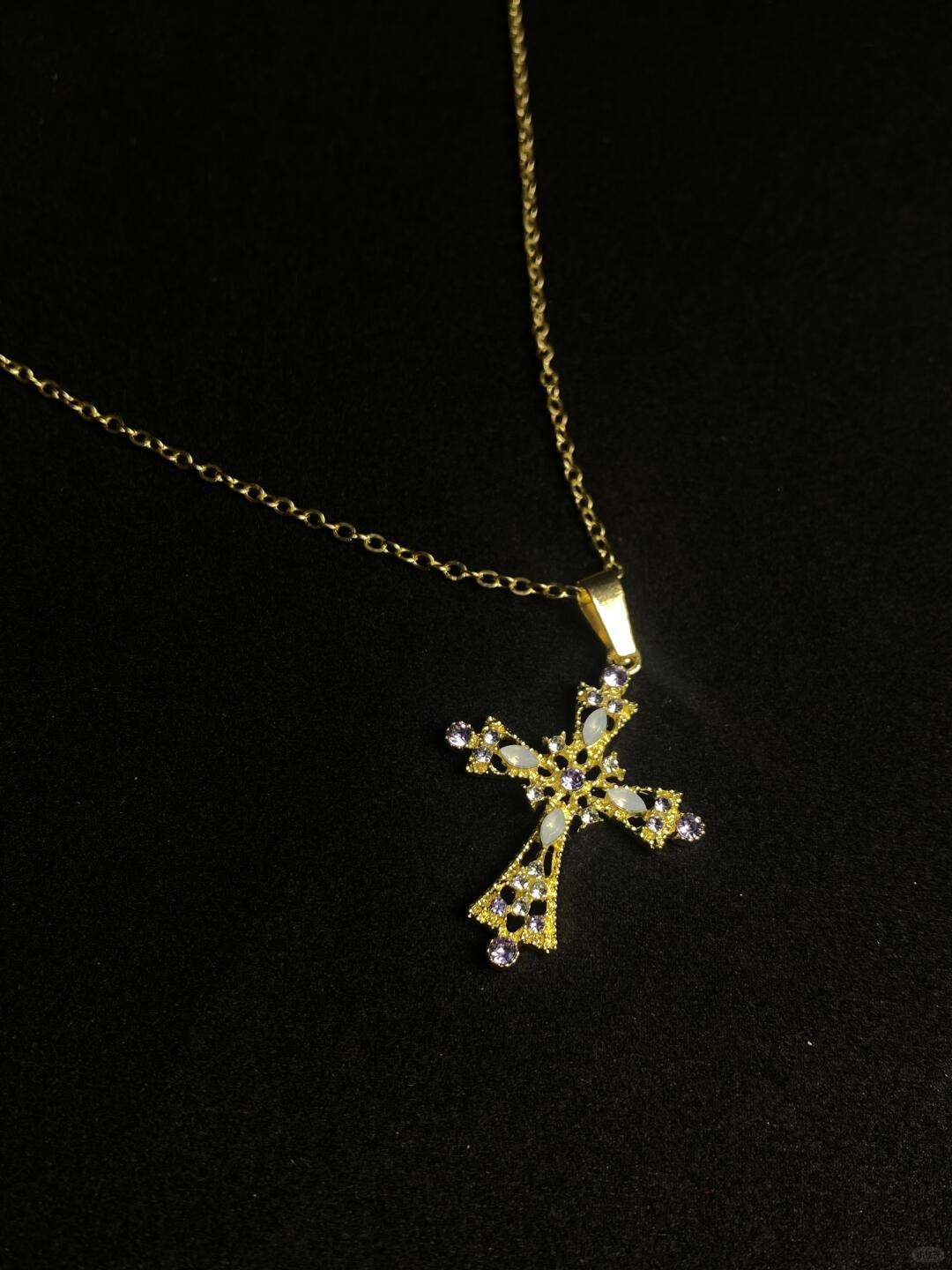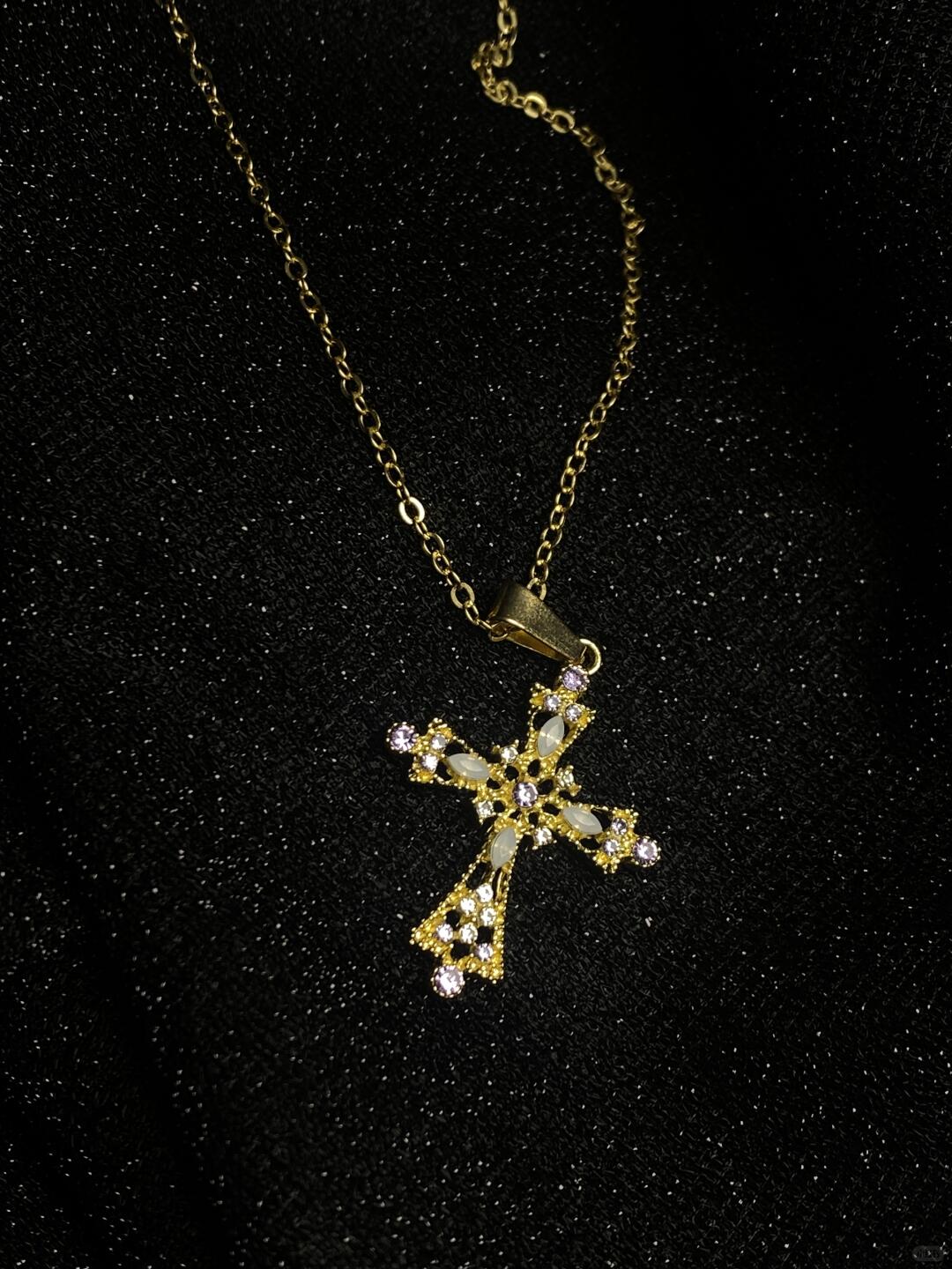 - Design: Hollow cross pendant with gemstone inlay