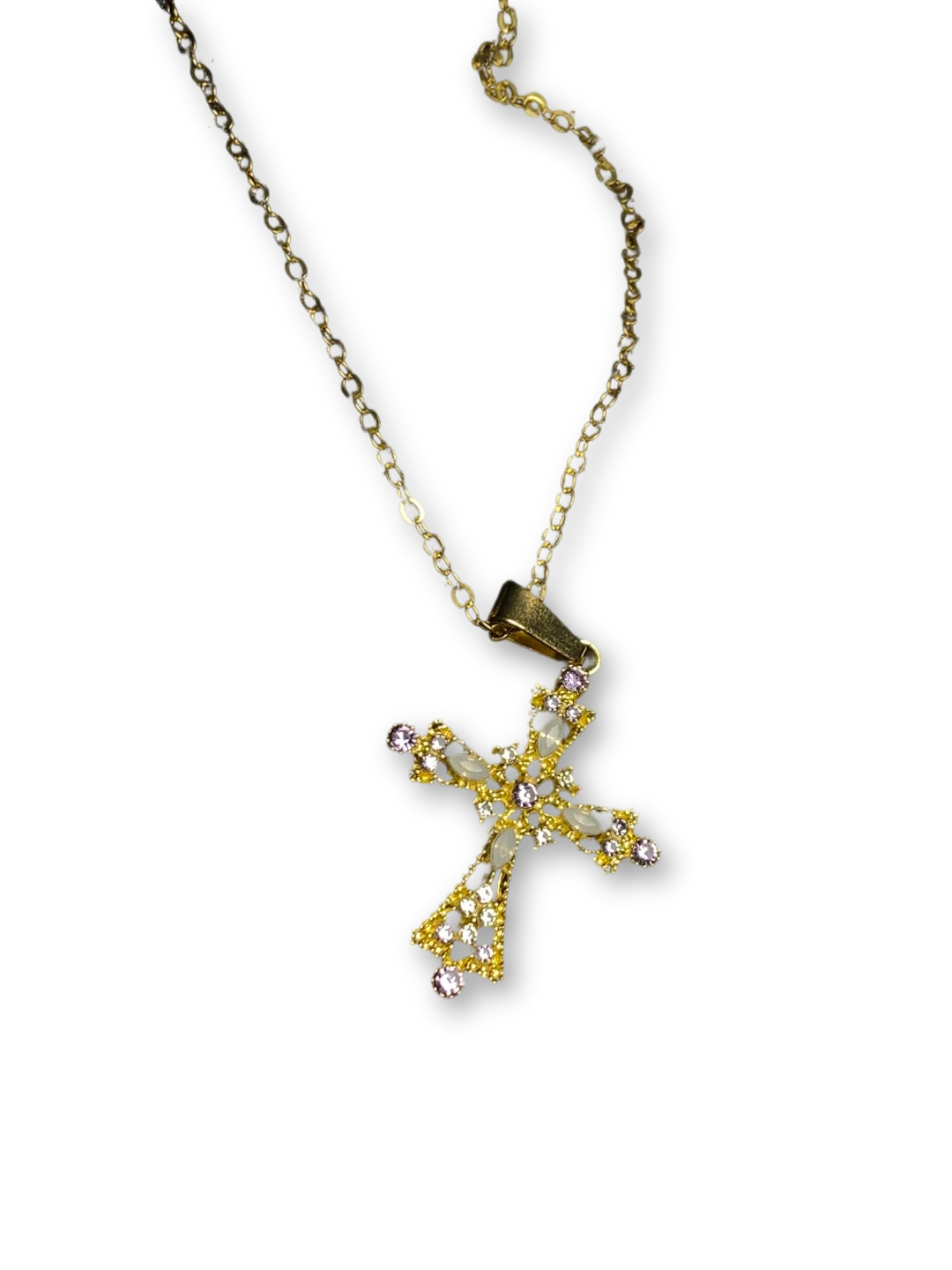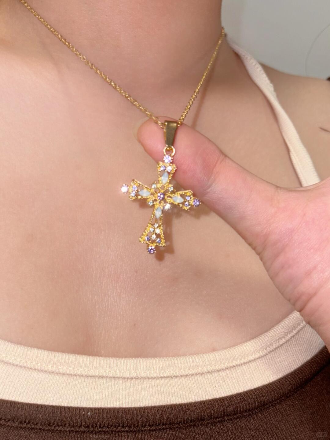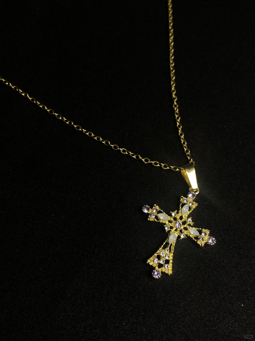 - Design: Hollow cross pendant with gemstone inlay