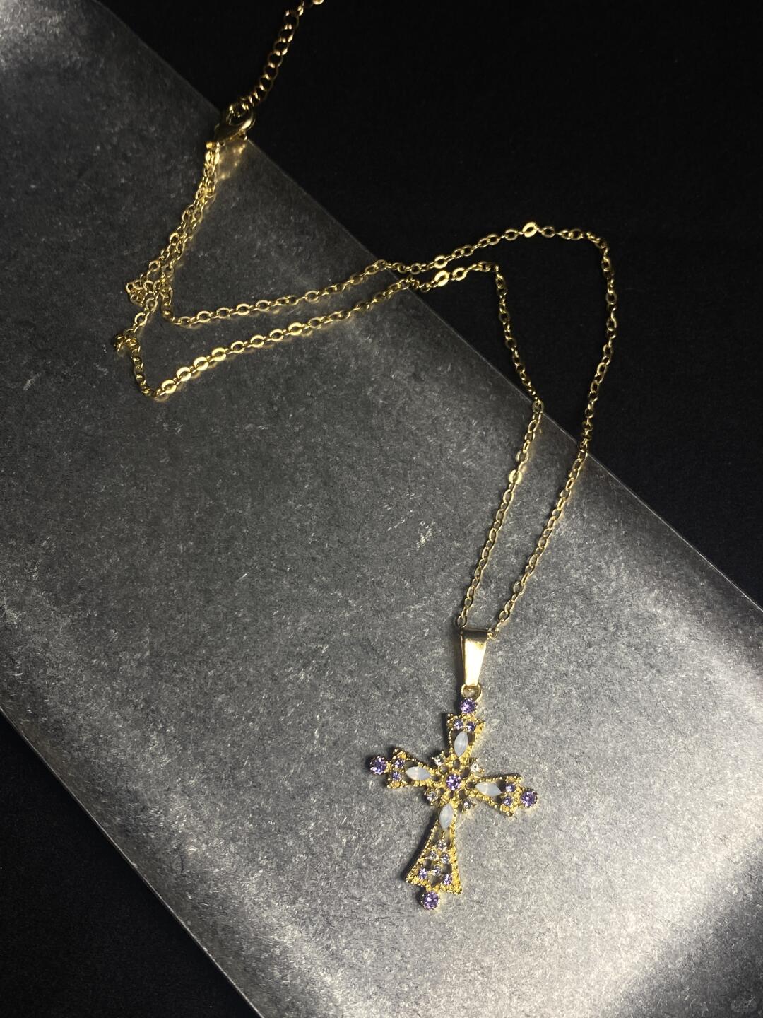 The Invoke Necklace is designed as a talisman of grace and intention. A hollow cross pendant set with violet zircon and white opal glows softly against the skin — refined, delicate, and quietly powerful.