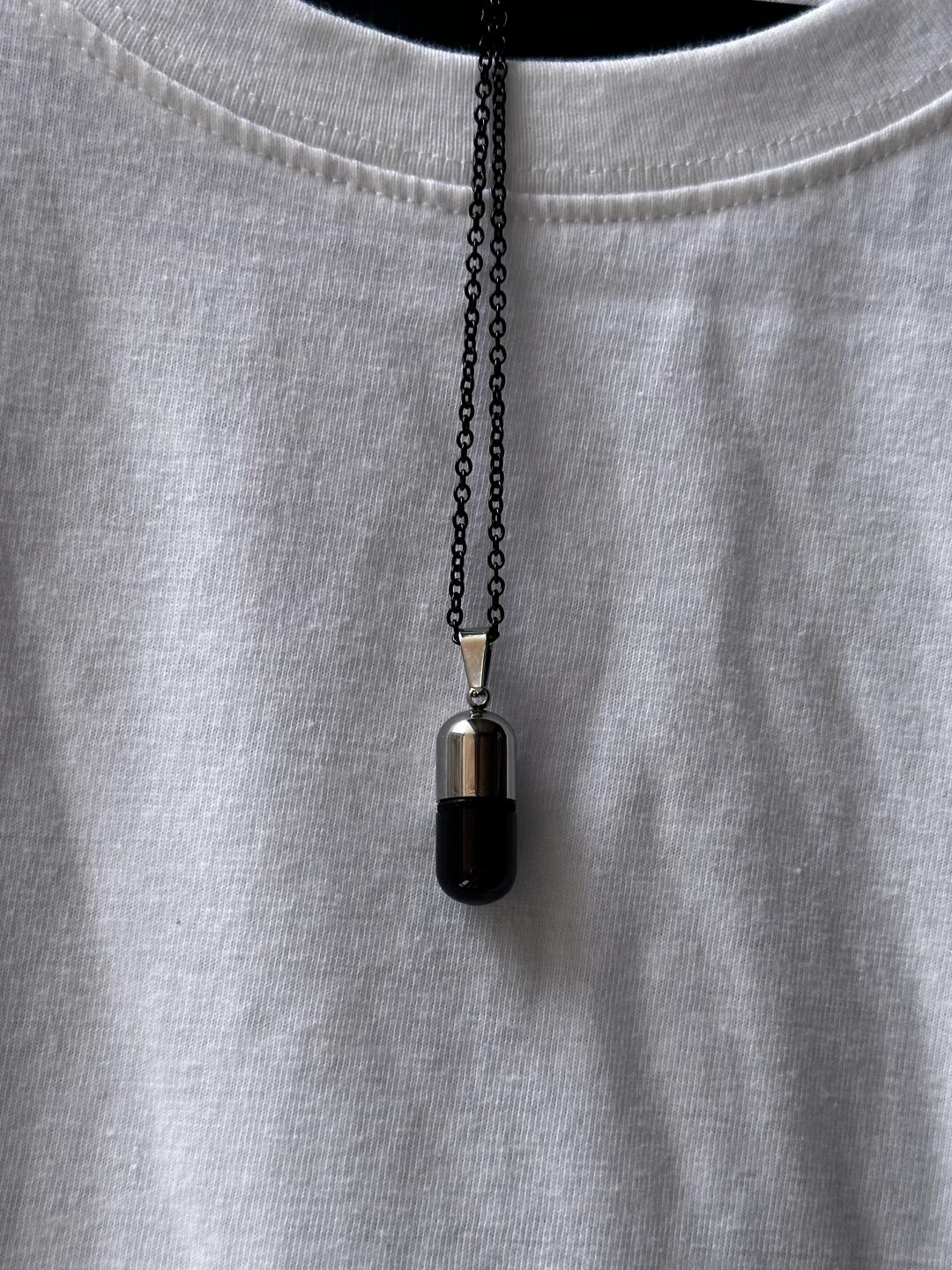 - Pendant: 12 mm glass vial filled with blood-red resin “poison”