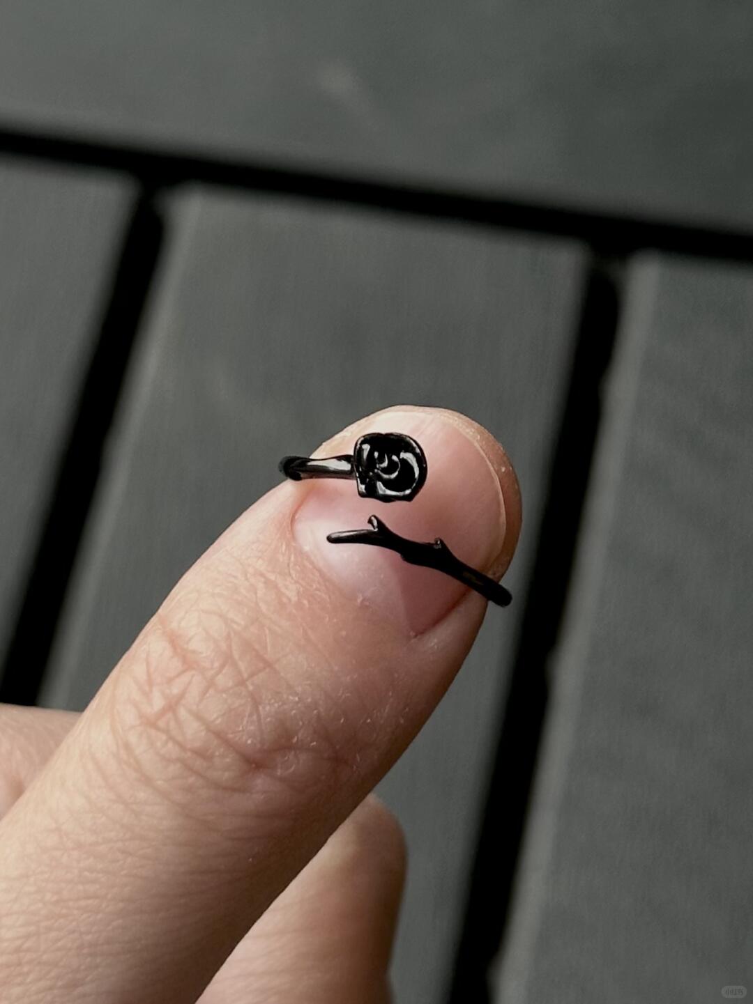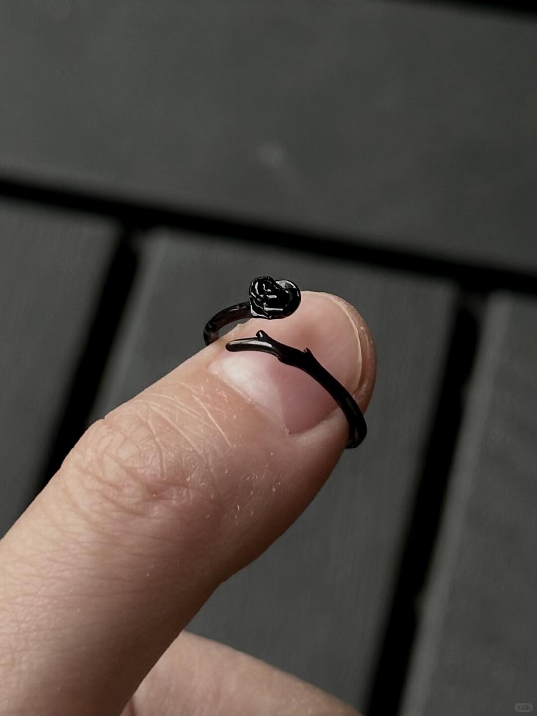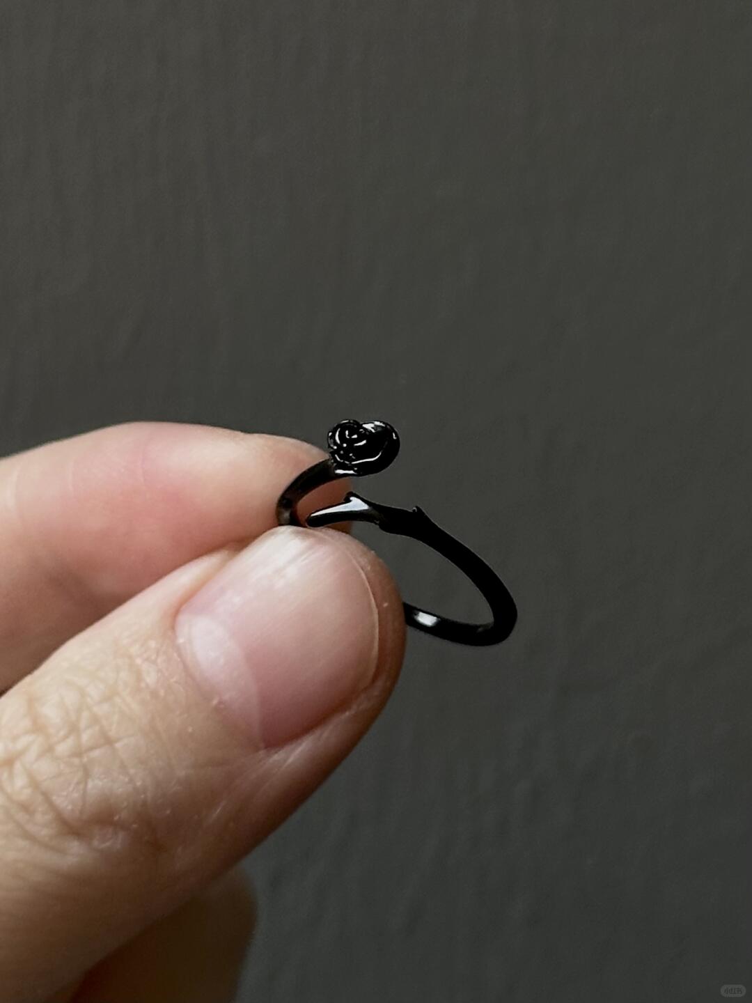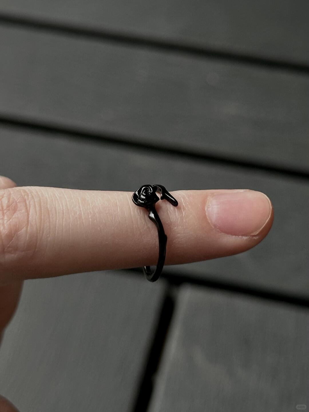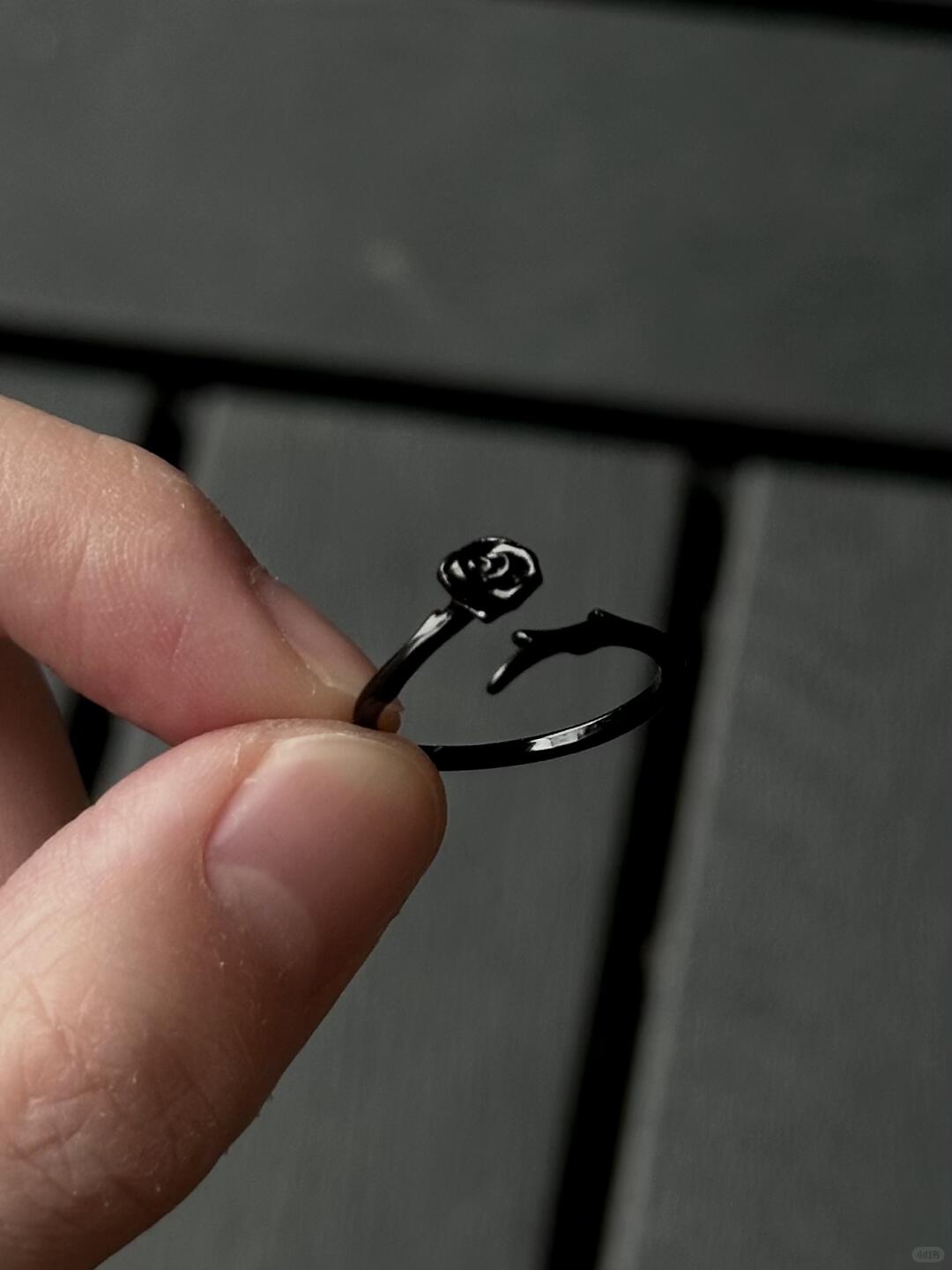 Crafted in a slim, adjustable form, the ring features a subtle sculpted rose perched above a winding thorn motif. Finished in oxidized silver-black, the texture feels aged, deliberate — like something that’s endured. It’s light in weight but pointed in character.