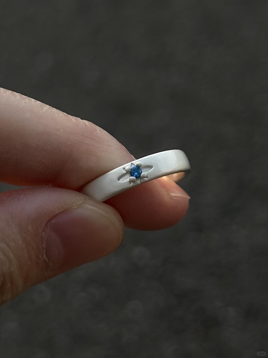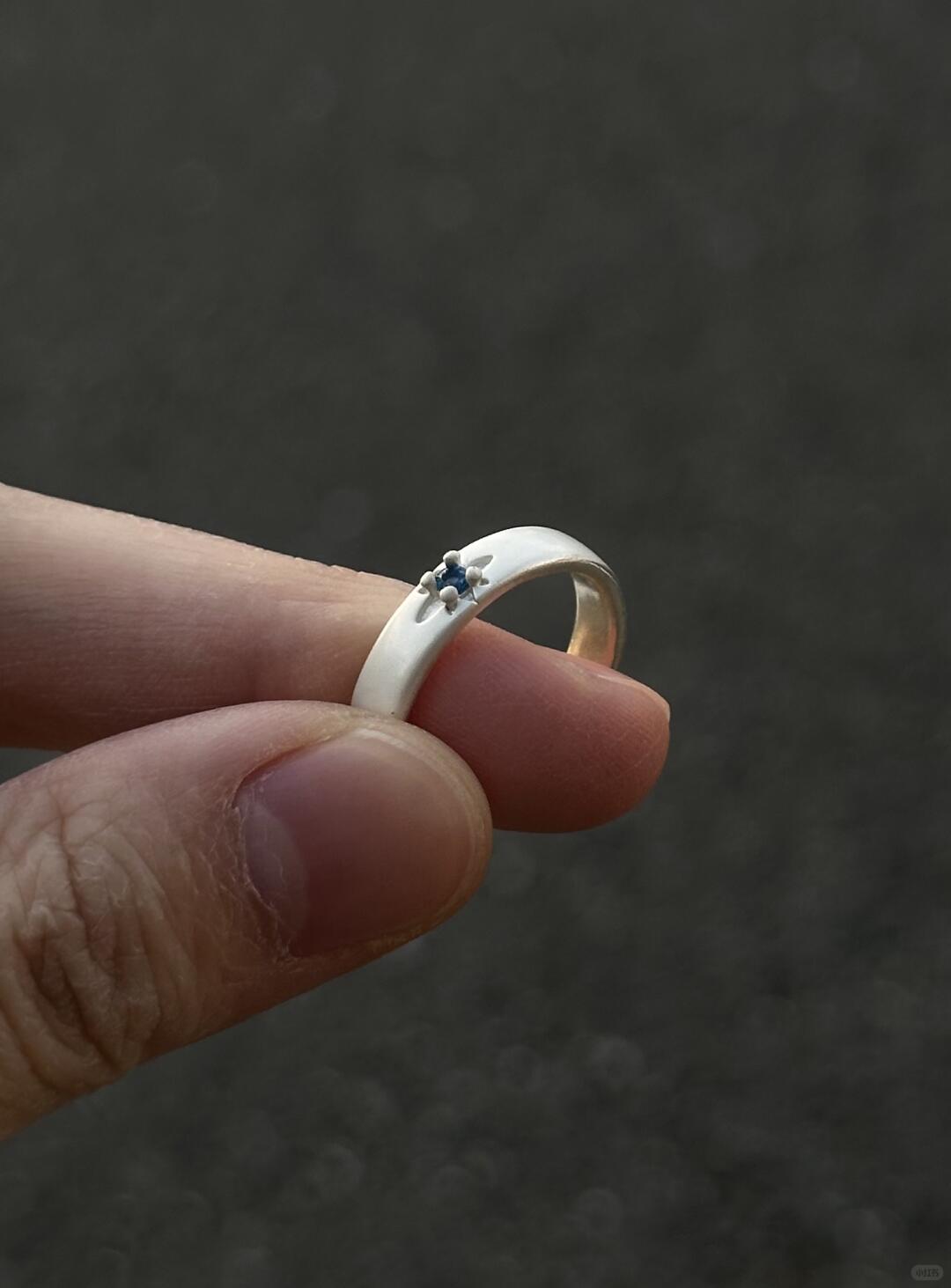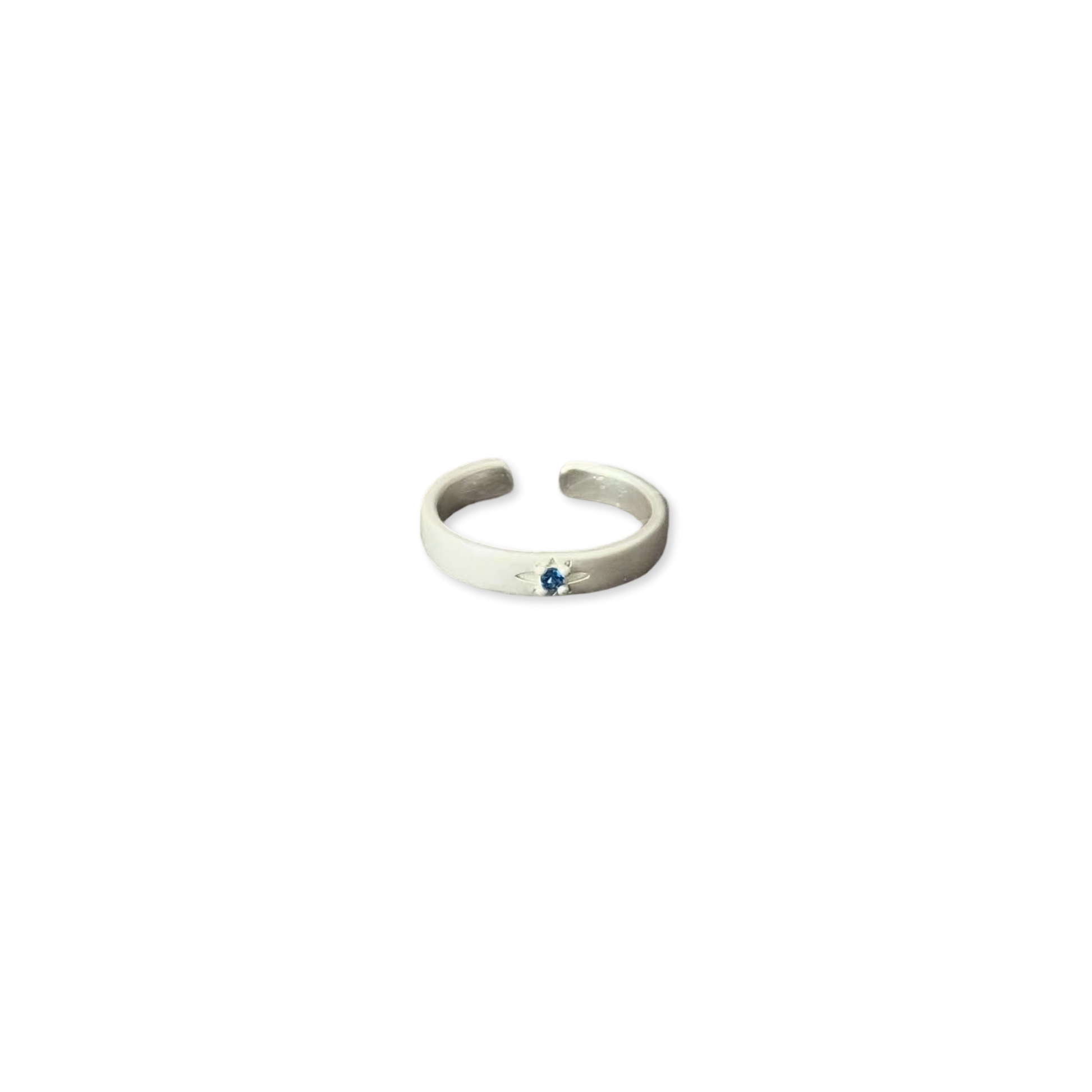 This ring is finished in a luminous ocean-blue sheen, glazed over a slim band with curved edges. The surface catches light like waves do — slowly, deliberately. Its minimal shape holds maximum feeling. Smooth, cool, and deep-toned, it rests lightly on the finger but leaves weight in its meaning.