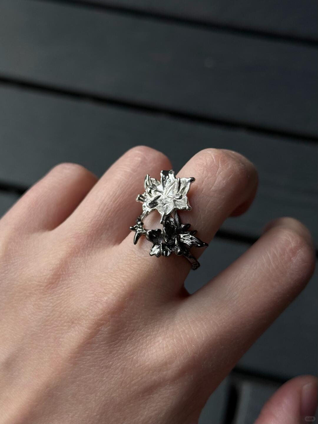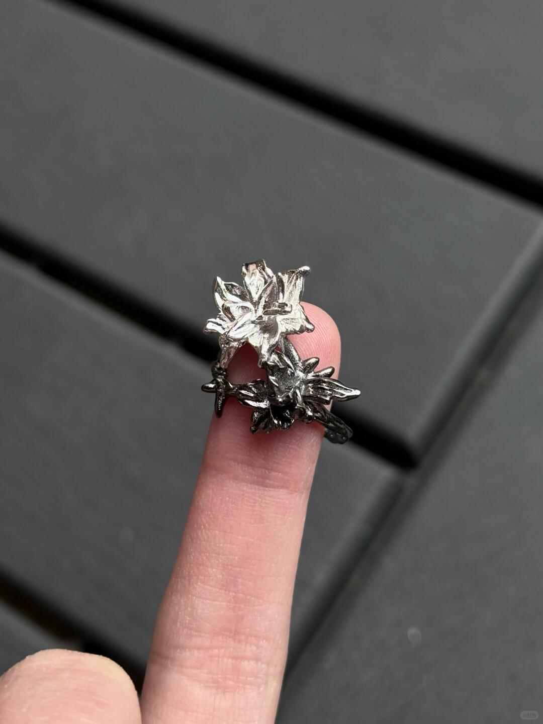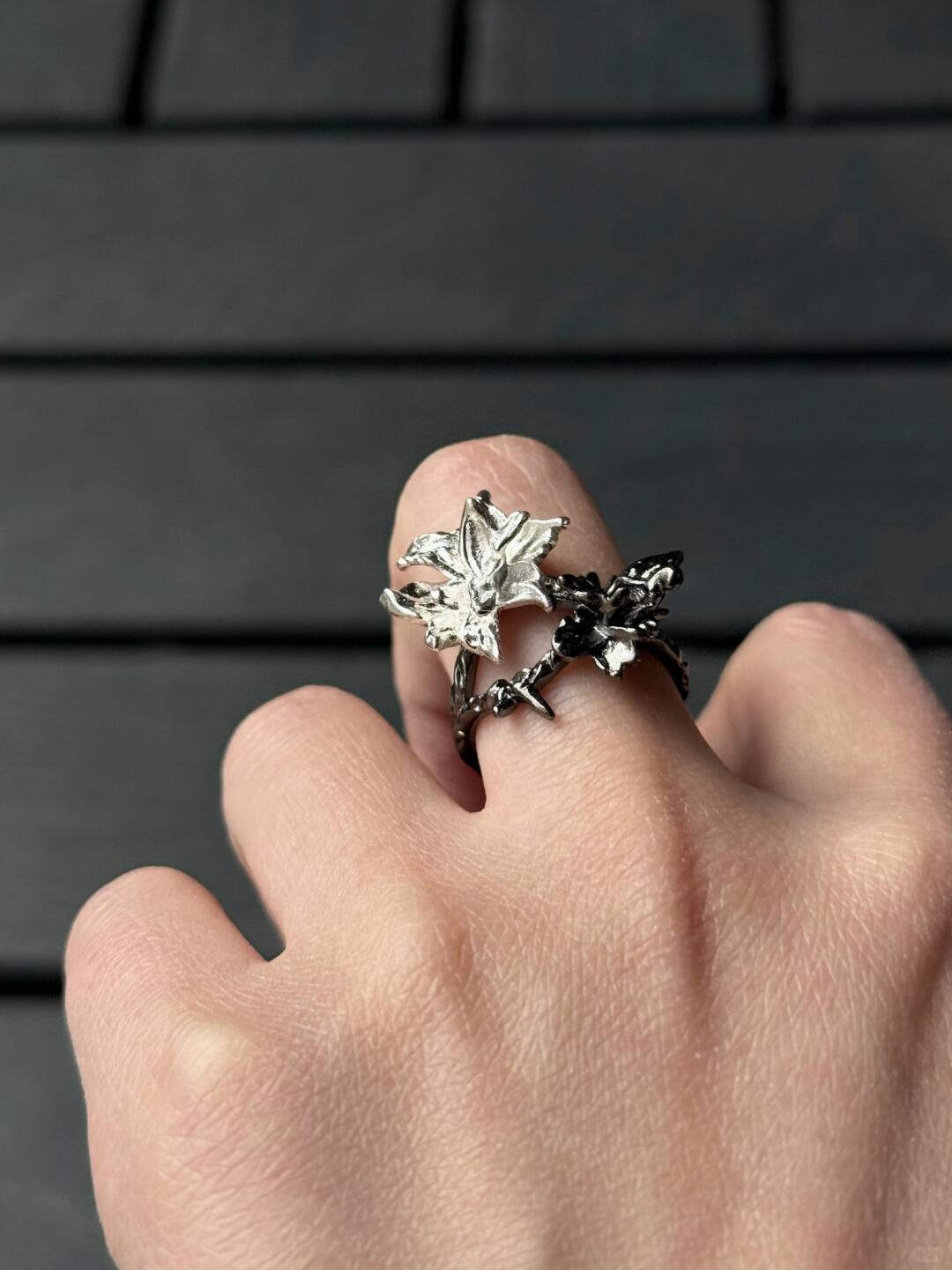 A twin flower must wither first that blooms. This ring mirrors that truth in its sculpted petals and intertwined stems, a tangible reminder that every joy carries its own fragility and grace.