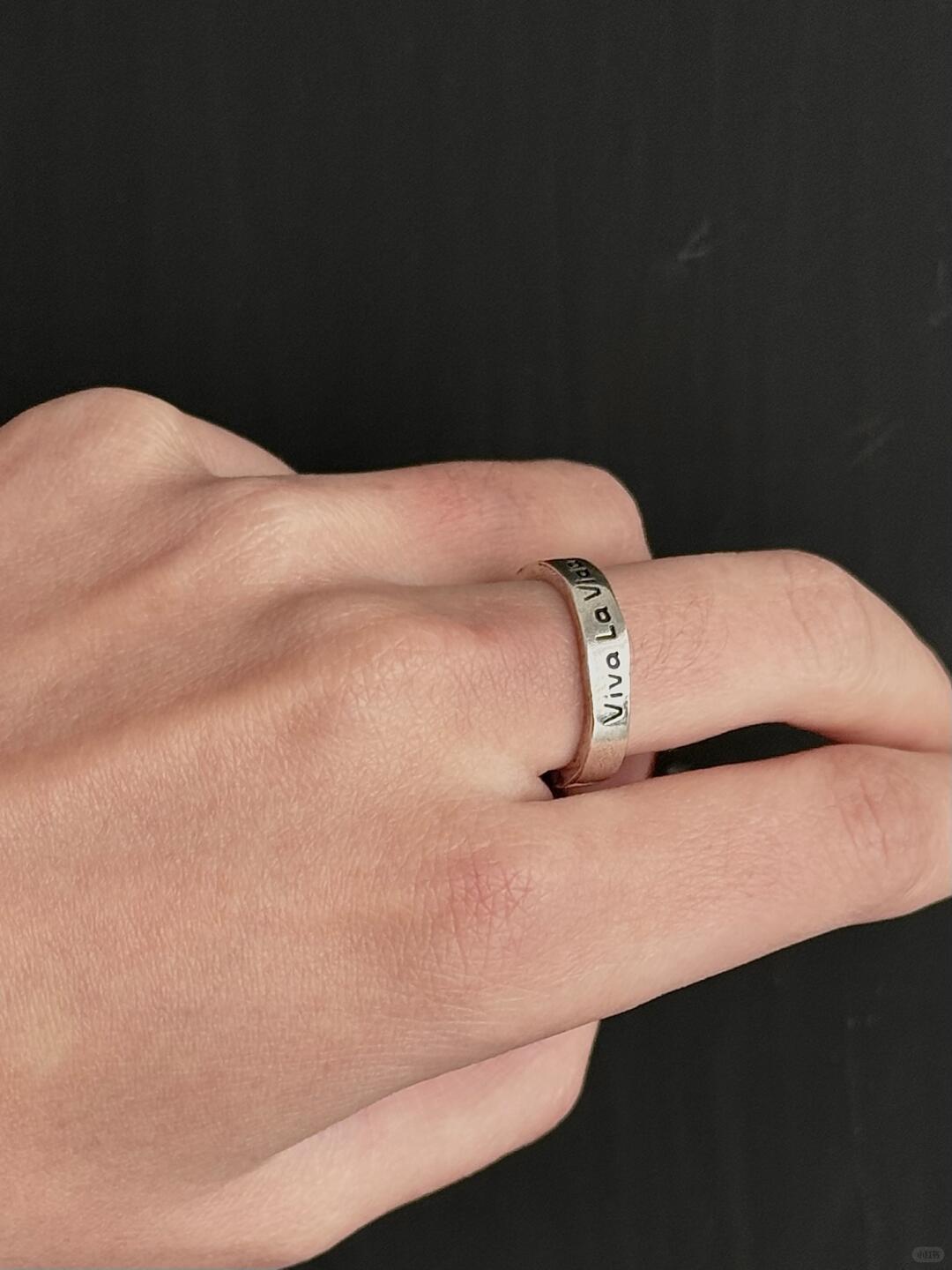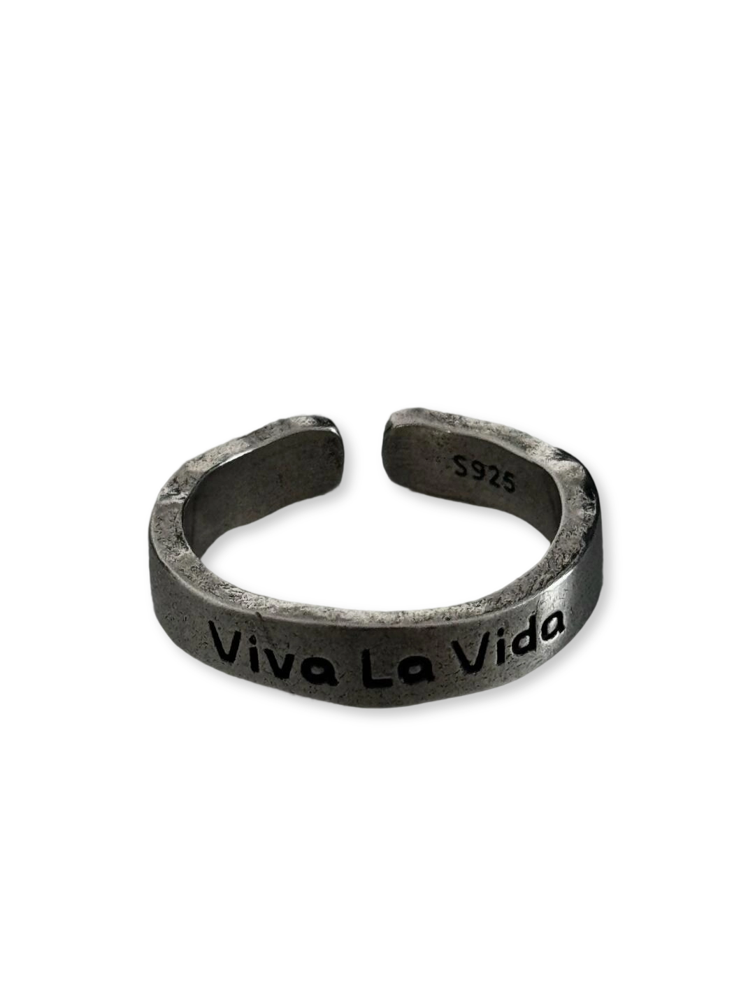 Each of the 26 letters is cast using traditional metal typography — the phrase VIVA LA VIDA wraps around the band, breaking at the seventh knuckle, where it resurrects as VIVA LA LIBERTÉ. The break is intentional — a scar turned symbol. The surface is raw, lightly oxidized, and full of handmade irregularity, echoing the texture of survival.