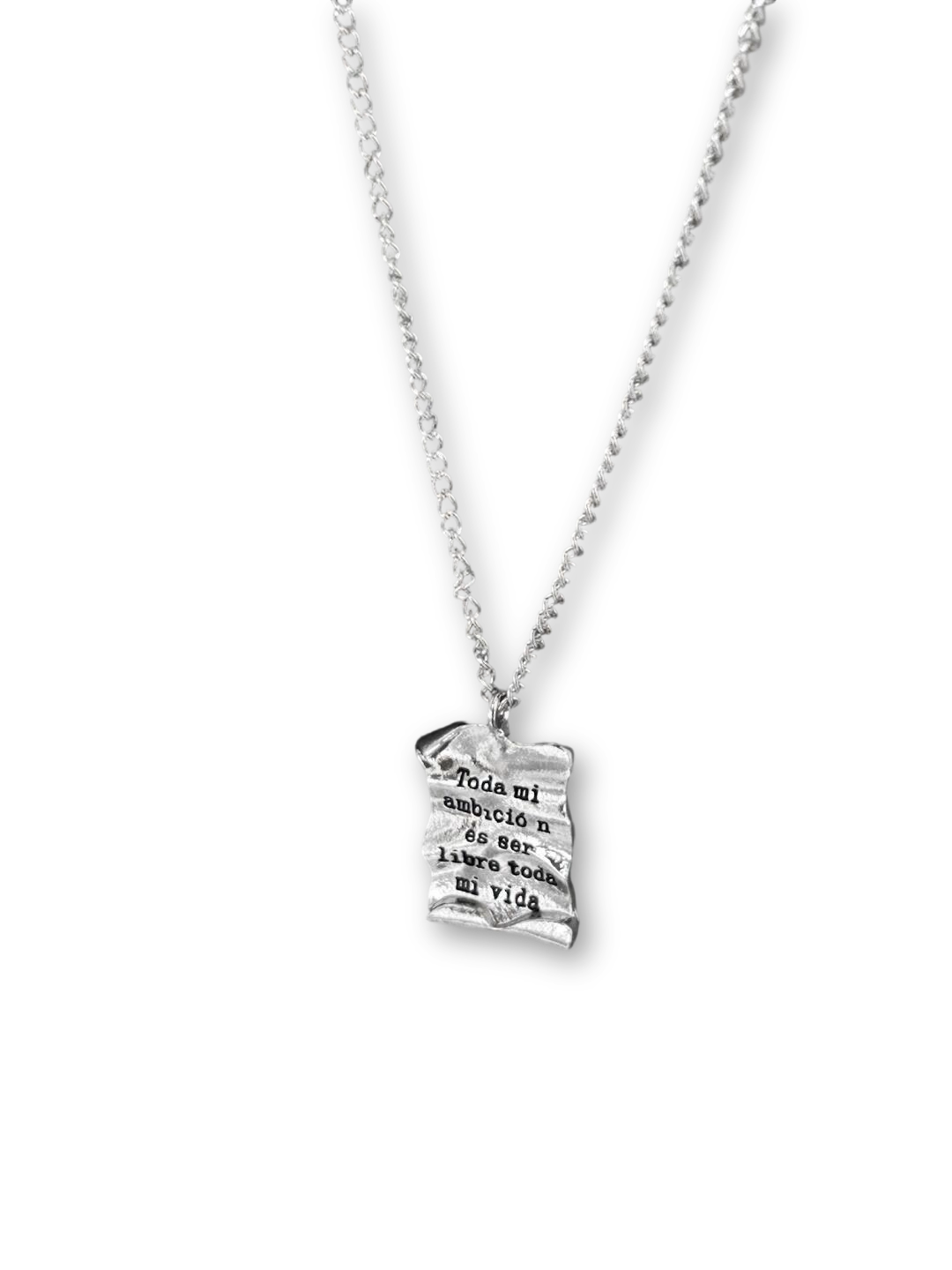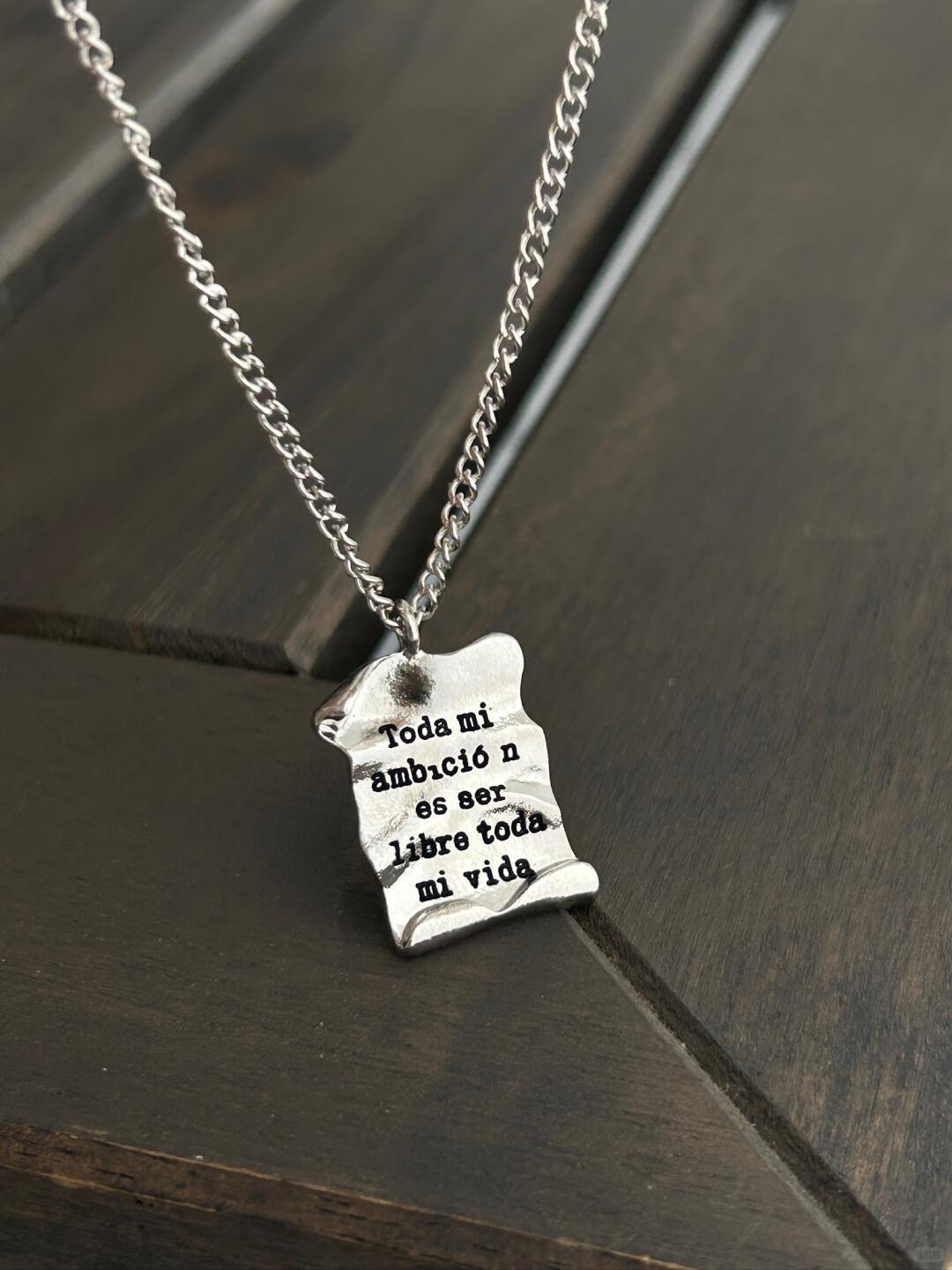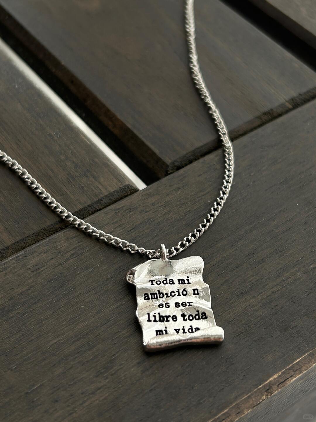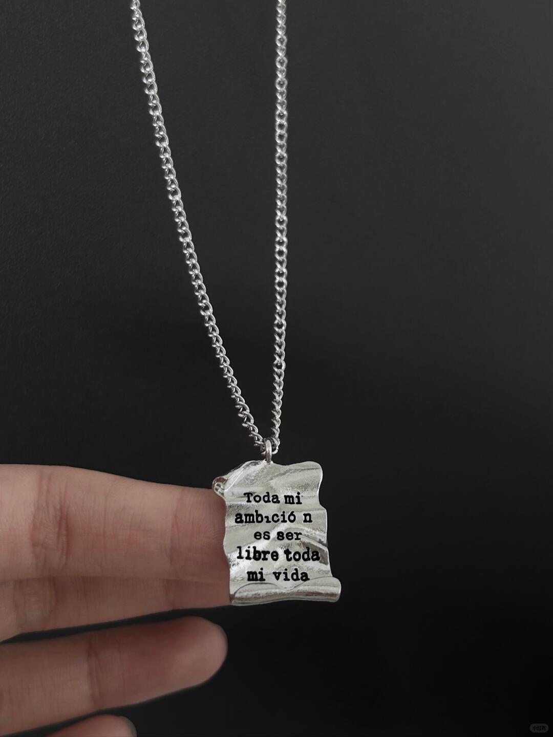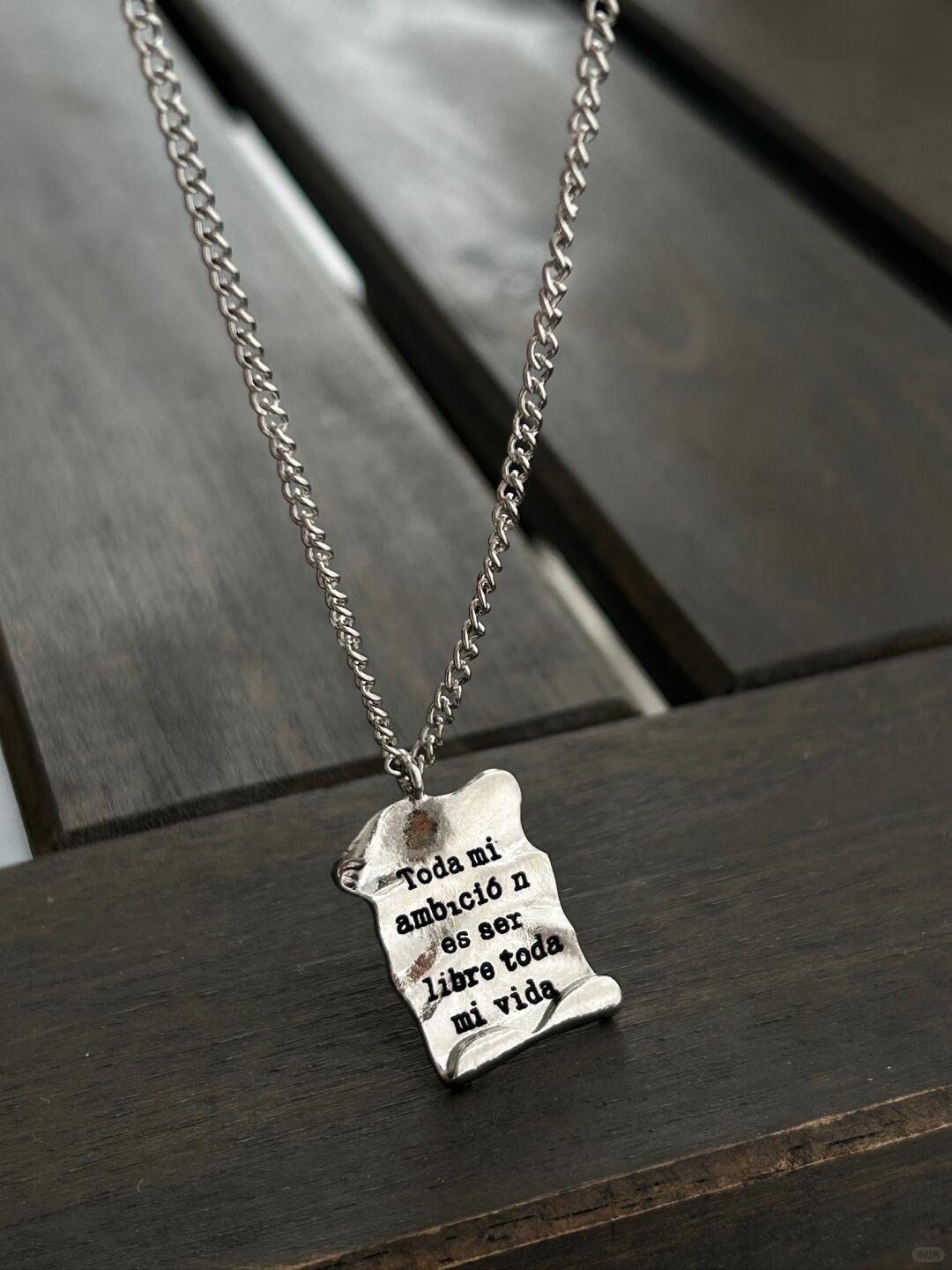 - Design: Scroll-inspired pendant with engraved text, symbolizing the pursuit of freedom and individuality